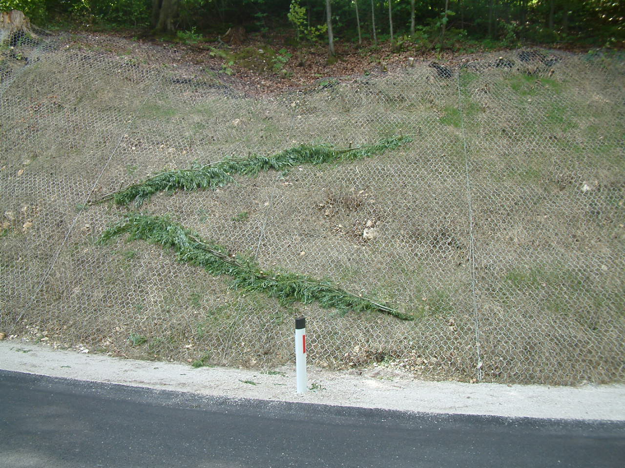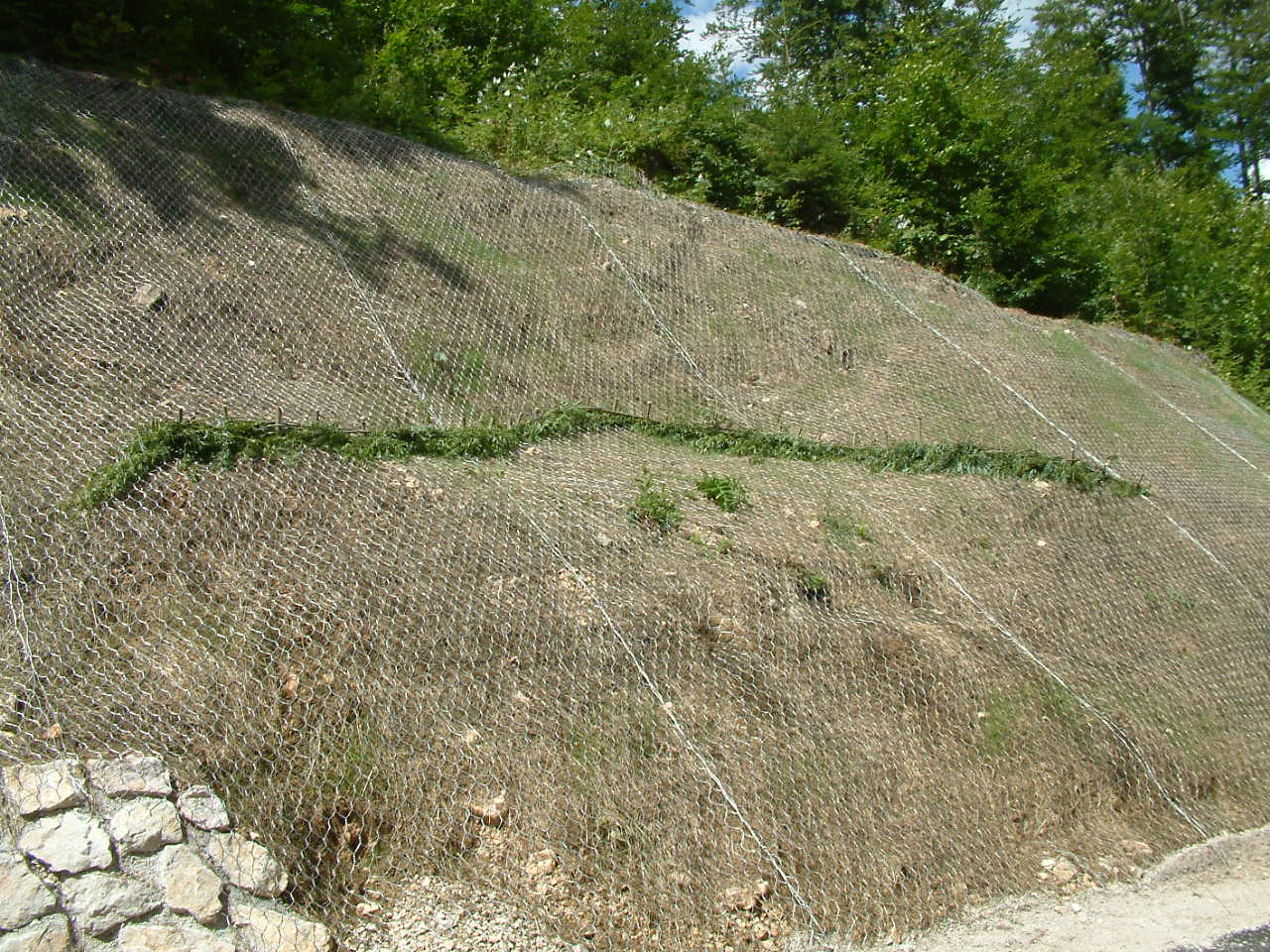 Ni pomembno samo to, da se brežina zaščiti z mrežo in kamenje ne leti več na cesto, ampak tudi to, da se brežina zaraste, zatravi in miruje. Tukaj bi rad pokazal brežino slikano 1.7.2018 na levi strani in isto brežino slikano 16.7.2018 na desni strani, se pravi 16 dni razlike je med temi slikami.